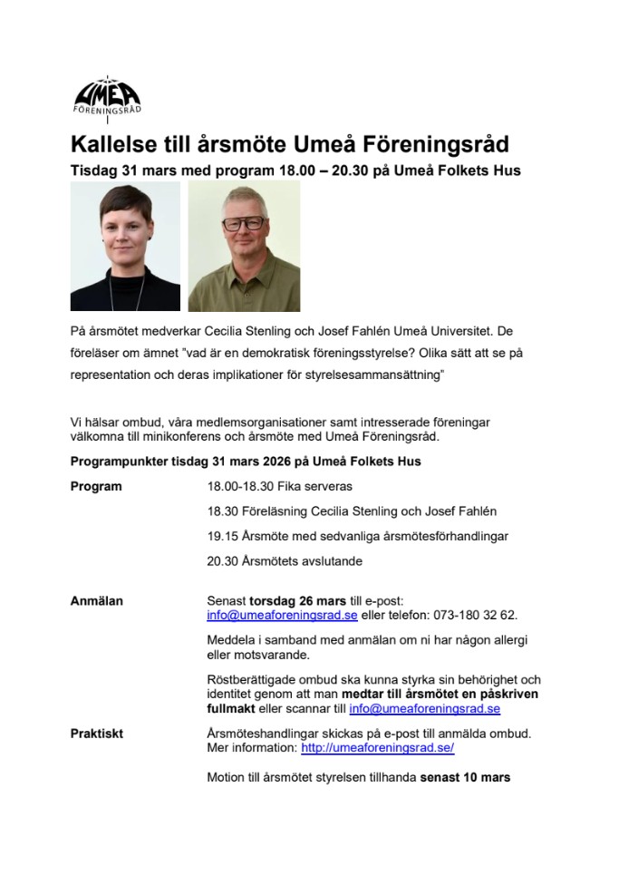Anmäl upp till två personer från Er förening senast 30 oktober till info@umeaforeningsrad.se